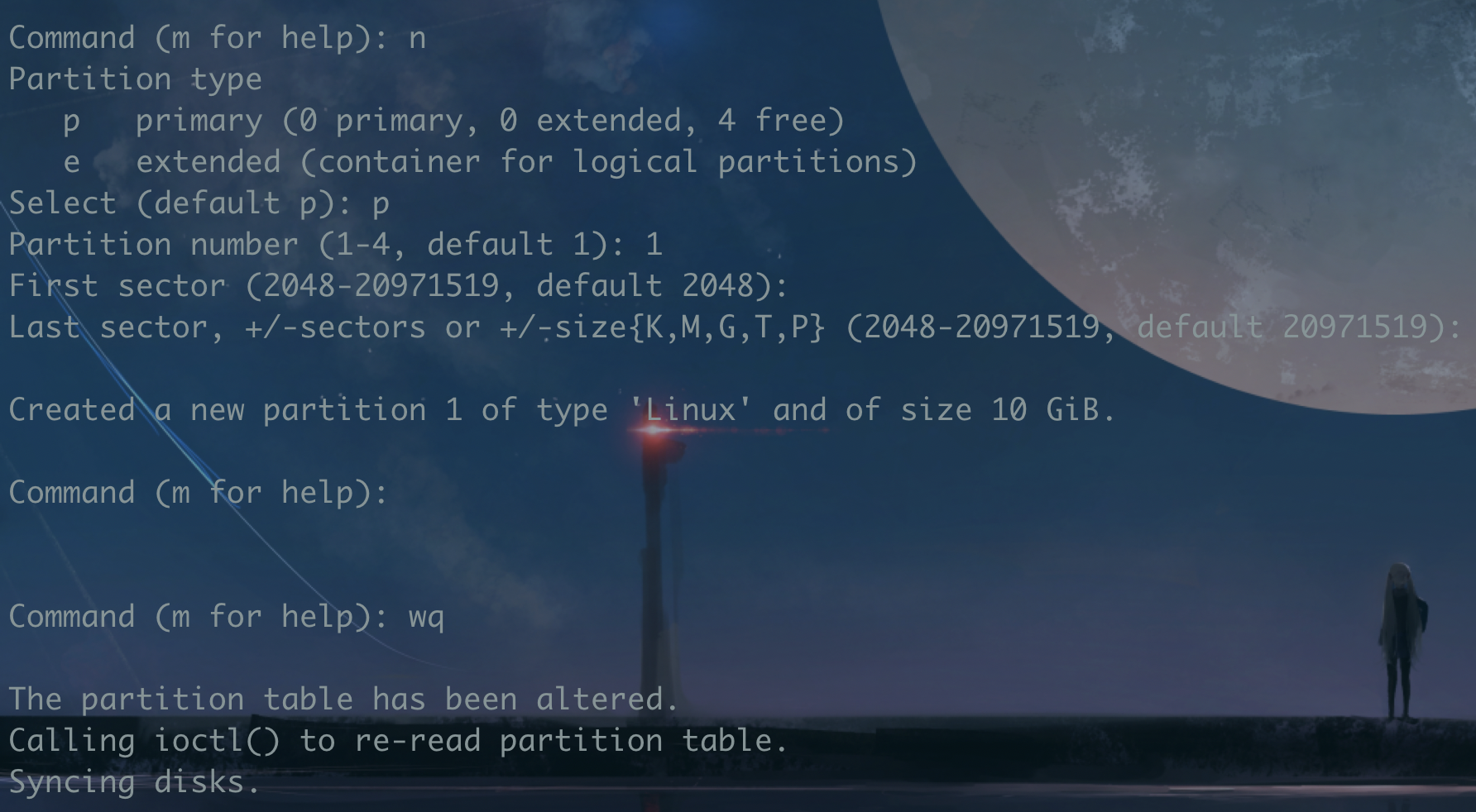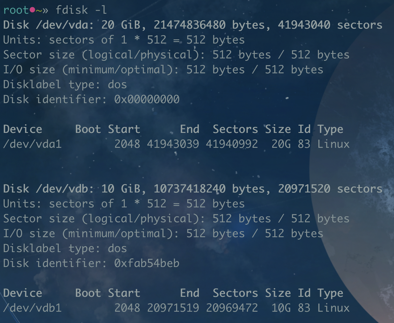 fdisk /dev/vdb,其中vdb替换成你的磁盘名。 - 输入