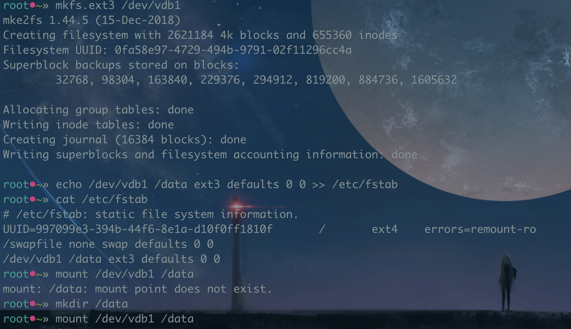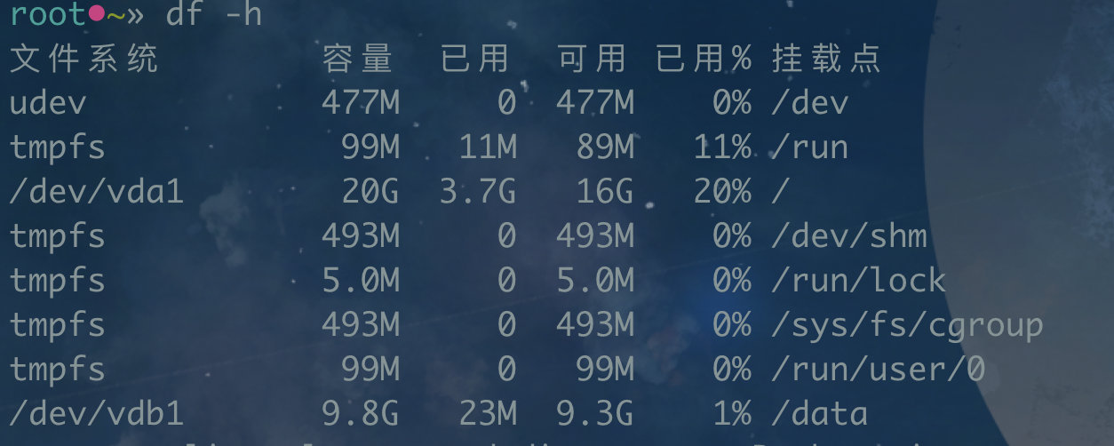 mount /dev/vdb1 /data,如果提示/data目录不存在,则先执行mkdir /data - 查看是否挂载成功