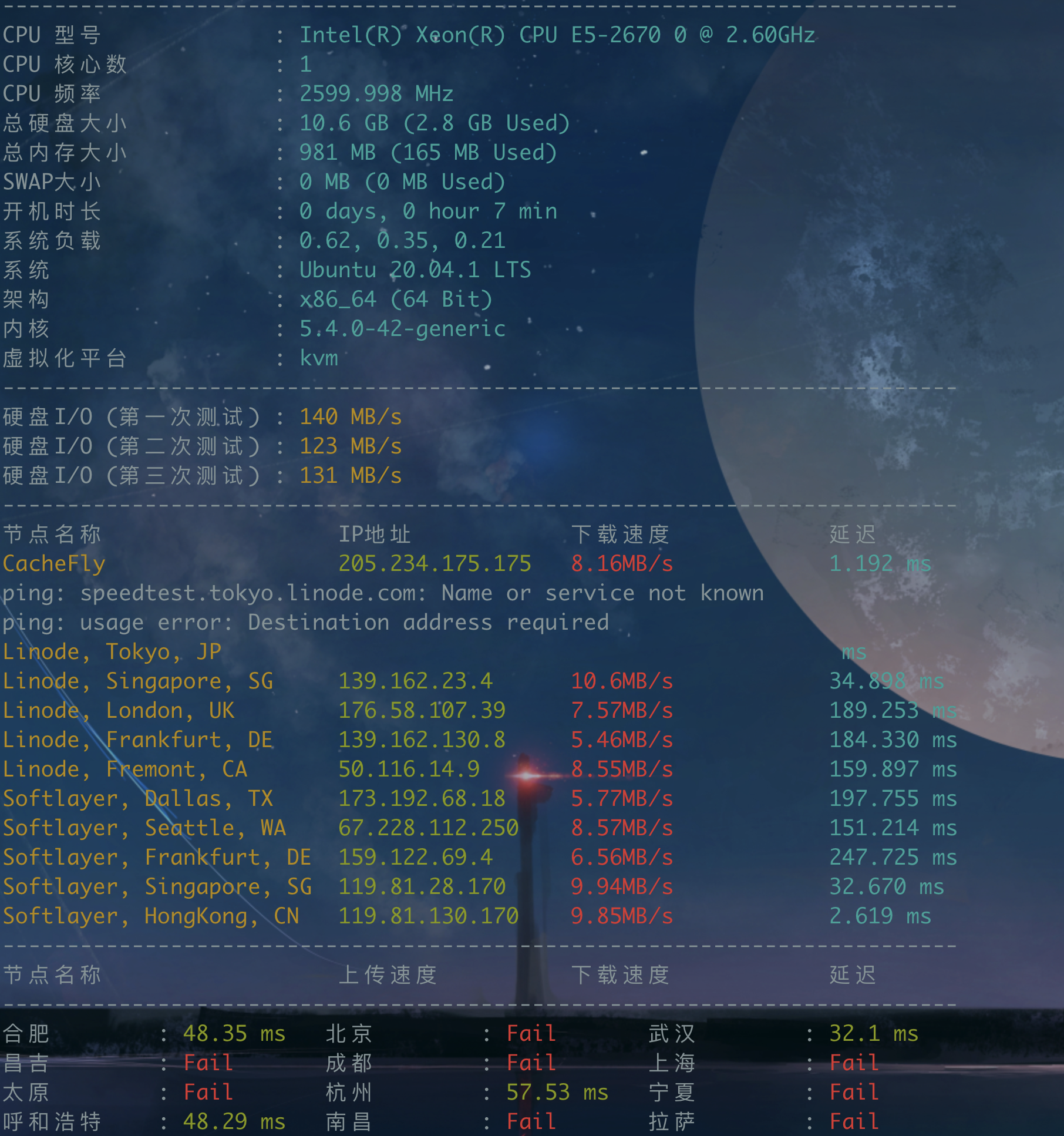 这是脚本返回的结果,从中可以看出vps的CPU、硬盘大小、硬盘IO和服务器带宽。